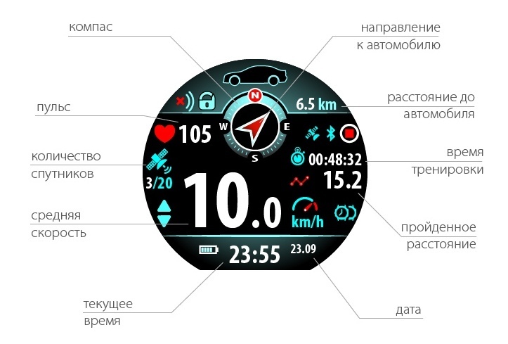 Но датчик еще немного умнее – в нём, кроме считывания электрокардиограммы, присутствует высокочувствительный акселерометр, который воспринимает баллистику сокращений миокарды непосредственно с грудной клетки, что важно при высокоинтенсивных тренировках, когда электрический контакт электродов ремешка может быть нестабилен из-за слишком большой амплитуды движений спортсмена. А напряженная работа сердца легко считывается по колебаниям наружной поверхности груди спортсмена. Конечно, не стоит ожидать чуда, мы продолжаем работать в этом направлении, но этот метод уже сейчас работает лучше, чем очень хорошие кардиометры, которым доверяют профессиональные спортсмены. А обновляется программа нашего ремешка, все так же просто – посредством Bluetooth с вашего телефона. Так что ждем интереса к этой модели со стороны людей, ведущих активный образ жизни, кто любит пробежки в парковых зонах. Это ведь удобно – на пробежке, часы на руке и следят за вашими показателями нагрузки и являются брелоком сигнализации автомобиля, оставленного на стоянке. Да и встроенная в часы навигация до автомобиля, если удалось заблудиться, окажется нелишней.