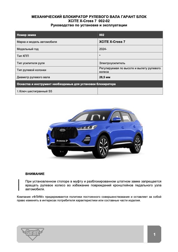 Блокиратор рулевого вала Гарант Блок Люкс 002.X/f/v для XCITE X-Cross 7 c 2024 г. РВ-ф28.5 - это надежный блокиратор рулевого вала, защищающий автомобиль от всех известных способов вскрытия.