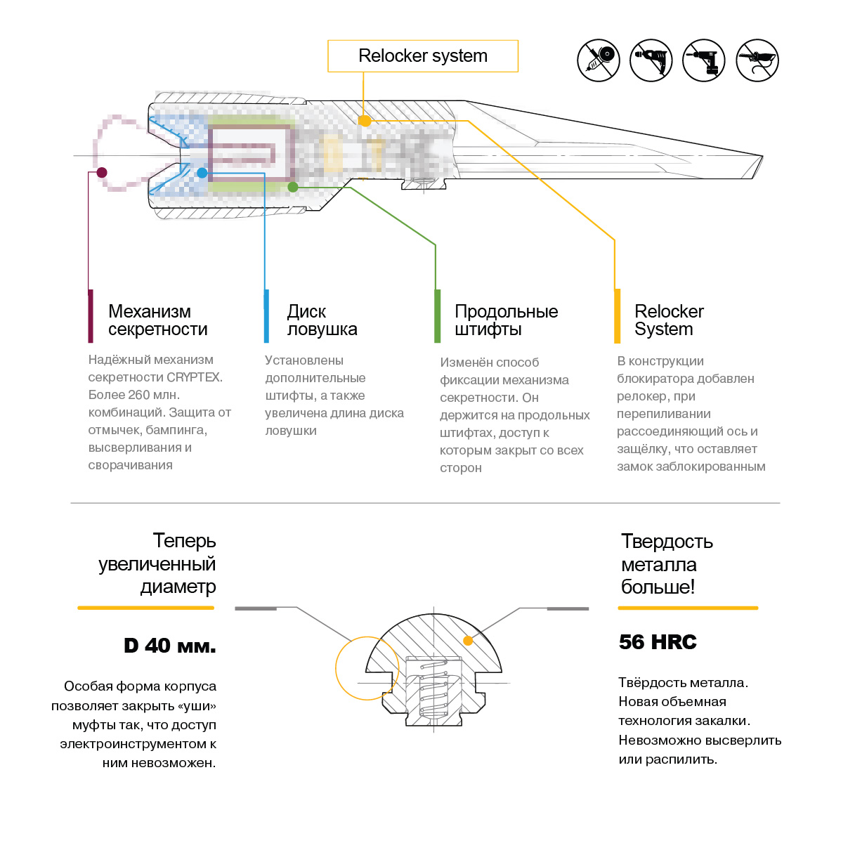 - увеличенный диск-ловушка, дополненный штифтами, позволяющими защититься от попыток высверлить замковый механизм