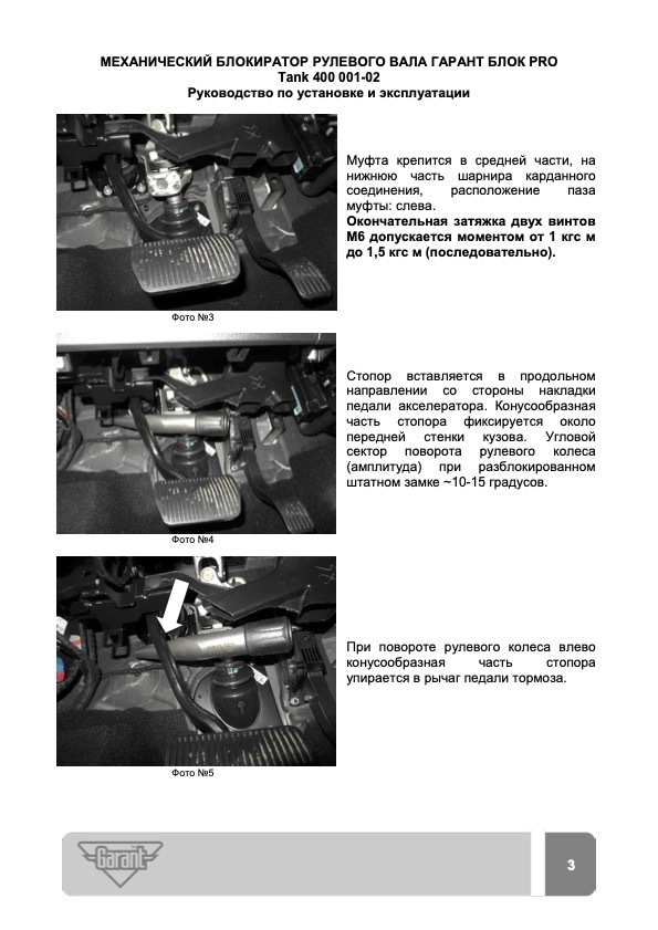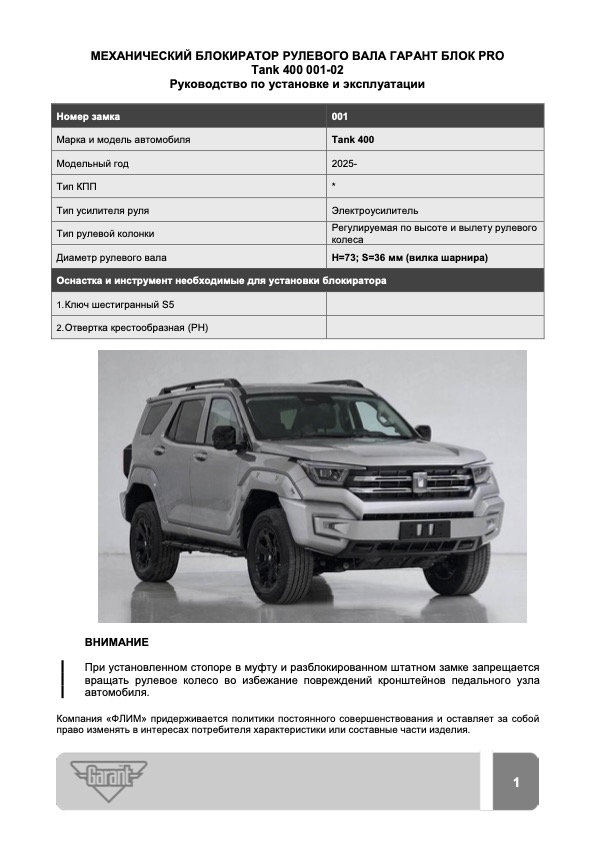 Блокиратор рулевого вала Гарант Блок PRO для TANK 400 c 2025 г. ЭлУР