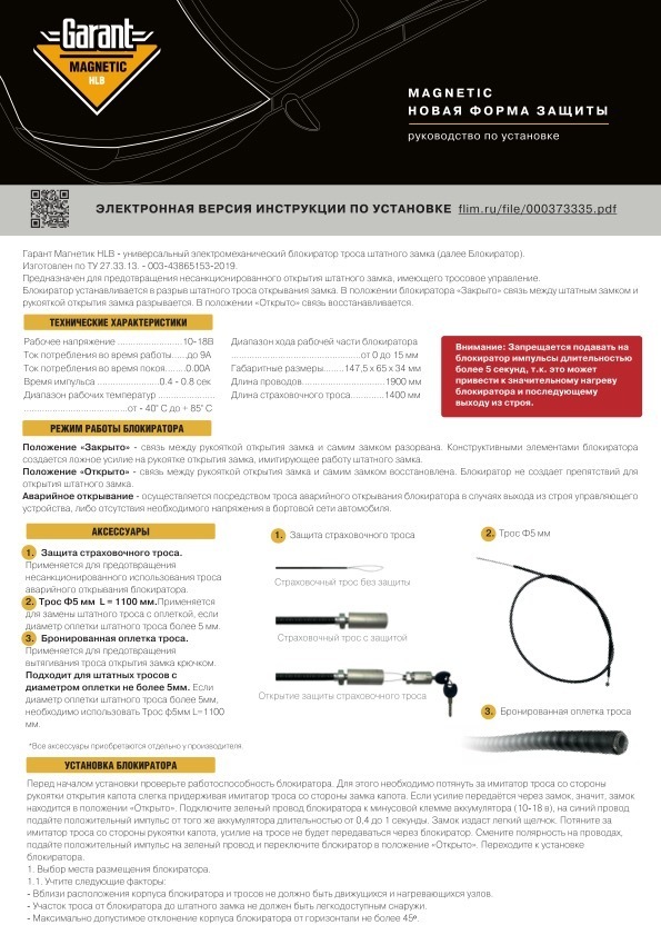 Гарант Магнетик HLB подключается к сигнализации автомобиля. При постановке авто в режим охраны Гарант Магнетик HLB разрывает связь между рычагом открытия замка капота и штатным замком капота. При снятии с охраны связь рычага и штатного замка капота восстанавливается.