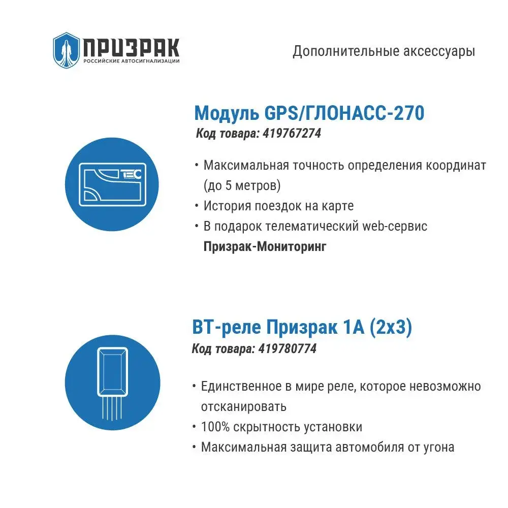 Базовый противоугонный функционал сигнализации может быть расширен за счет применения смартфона в качестве метки и дооснащения дополнительным беспроводным CAN-реле Implant. Контроль за состоянием охраны и параметрами автомобиля, а также управление сигнализацией осуществляются при помощи мобильного приложения Призрак и/или web-сервиса Призрак-Мониторинг. Это позволяет всегда быть в курсе того, что происходит с автомобилем, вне зависимости от расстояния.